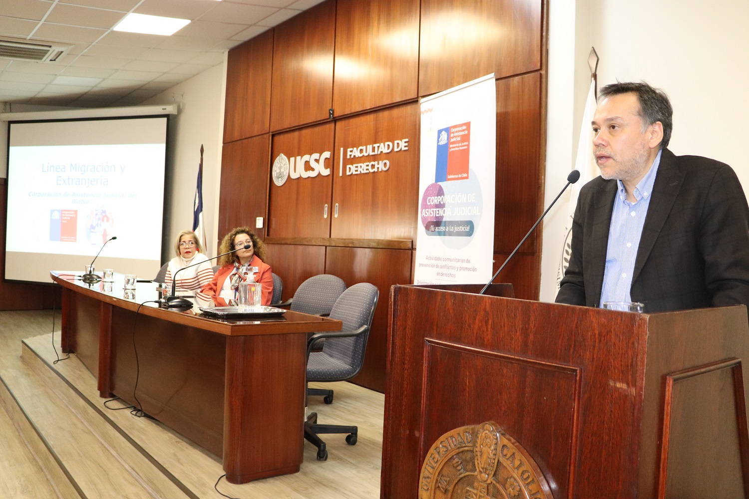Autoridades, jefes de servicios, organizaciones de migrantes, gremios y funcionarios de las distintas unidades operativas de la institución participaron de la jornada desarrollada en la Facultad de Derecho de la UCSC.