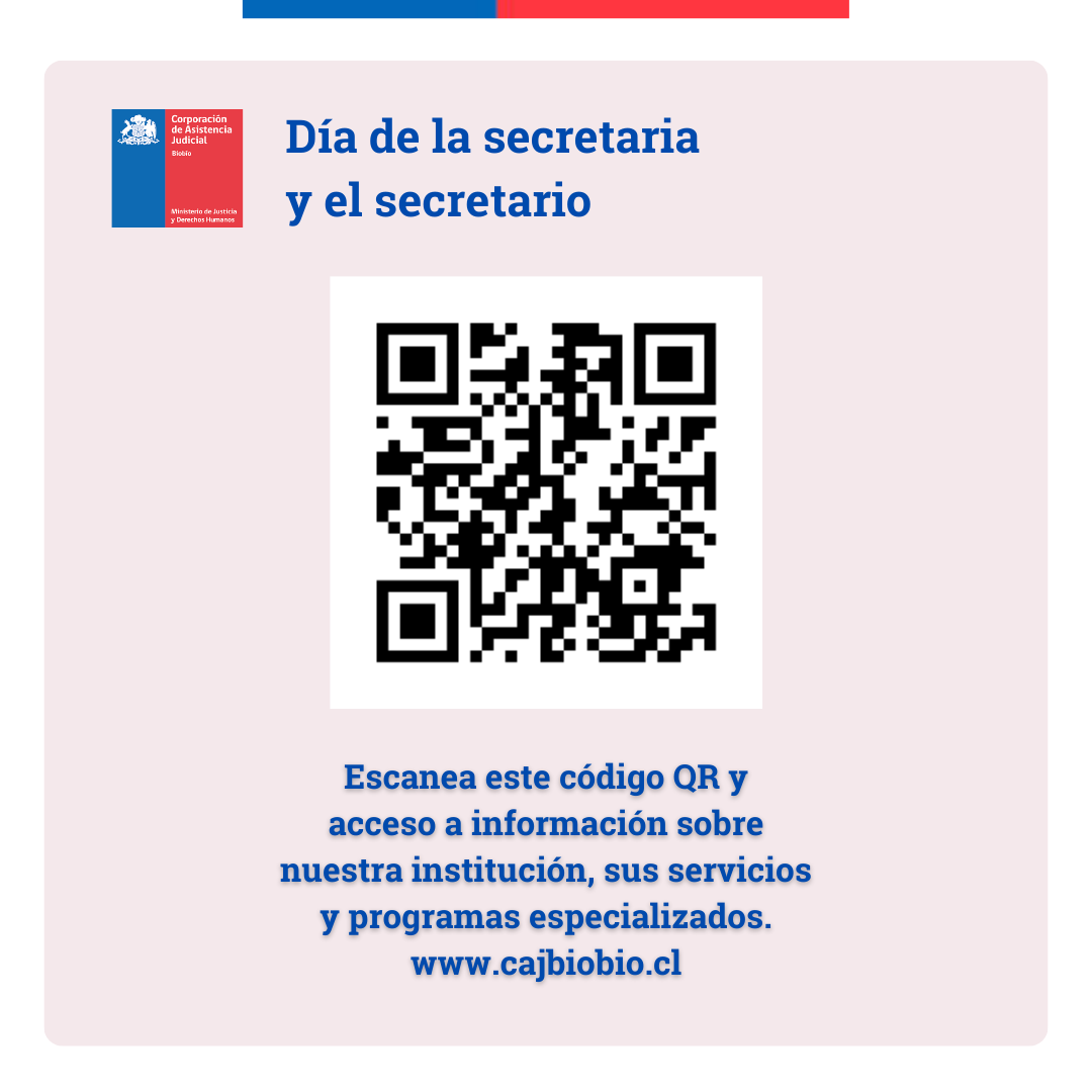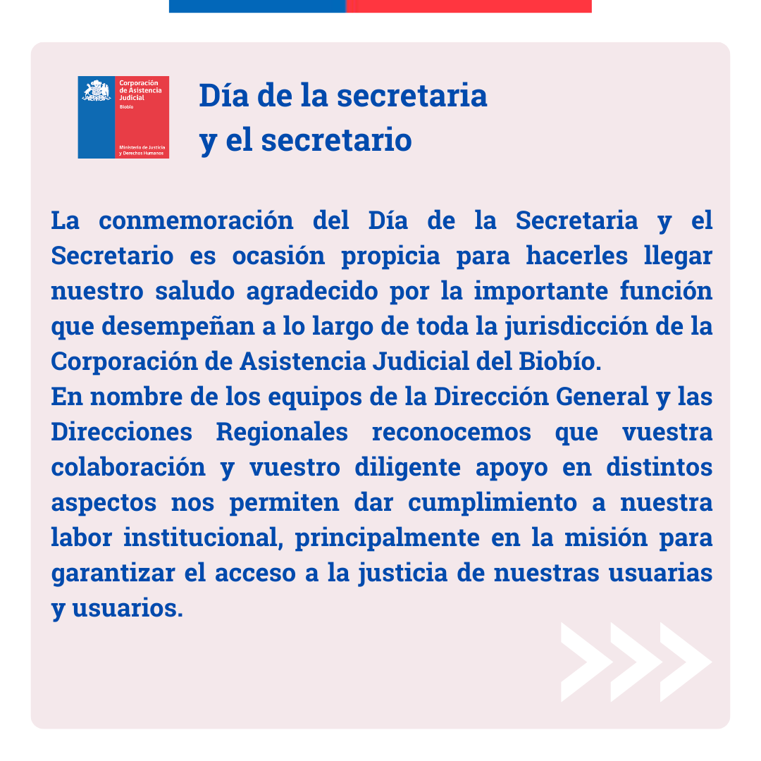 La conmemoración del Día de la Secretaria y el Secretario es ocasión propicia para hacerles llegar nuestro saludo agradecido por la importante función que desempeñan a lo largo de toda la jurisdicción de la Corporación de Asistencia Judicial del Biobío. En nombre de los equipos de la Dirección General y las Direcciones Regionales reconocemos que vuestra colaboración y vuestro diligente apoyo en distintos aspectos nos permiten dar cumplimiento a nuestra labor institucional, principalmente en la misión para garantizar el acceso a la justicia de nuestras usuarias y usuarios.