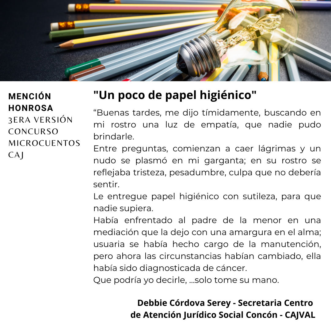 • “Un poco de papel higiénico”. Debbie Catherine Córdova Serey, Secretaria Centro de Atención Jurídico Social Concón, CAJVAL.