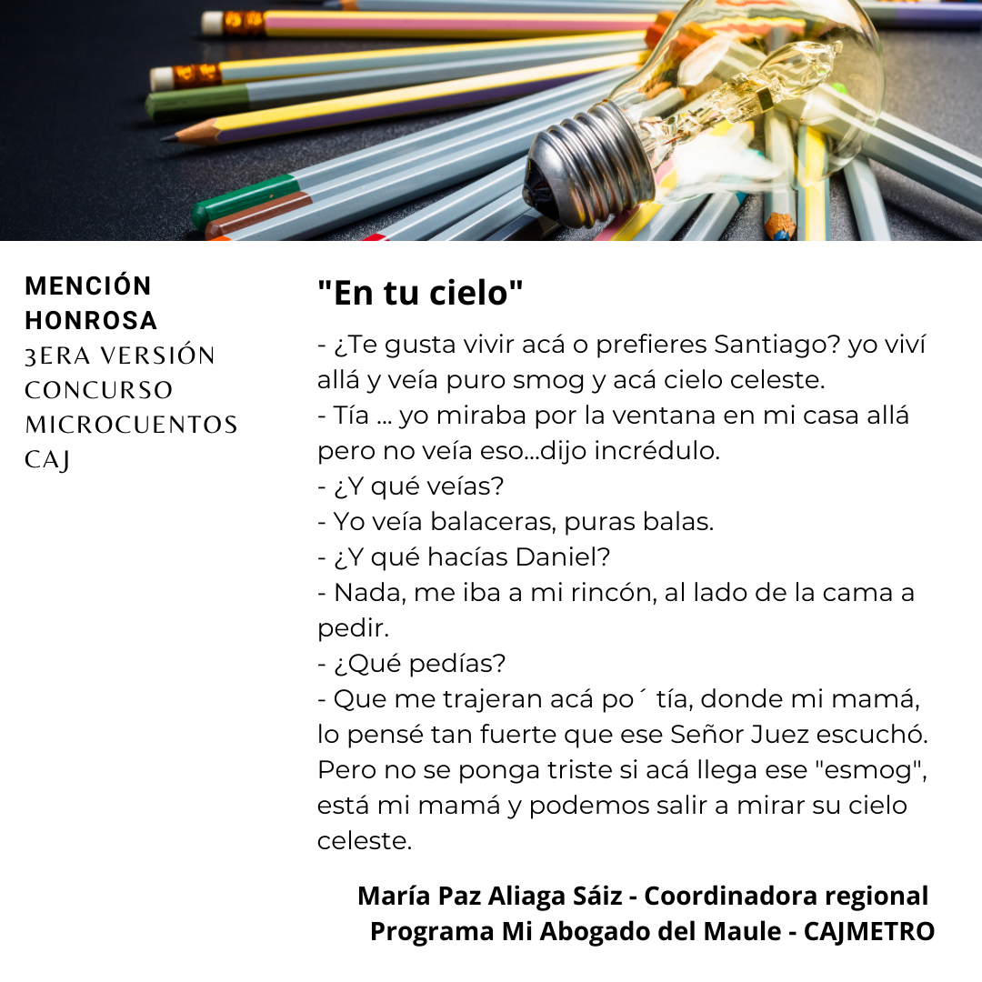 • “En tu cielo”. María Paz Aliaga Sáiz. Abogada Coordinadora Regional - Programa Mi Abogado Maule. CAJMETRO.