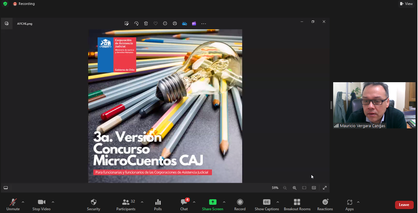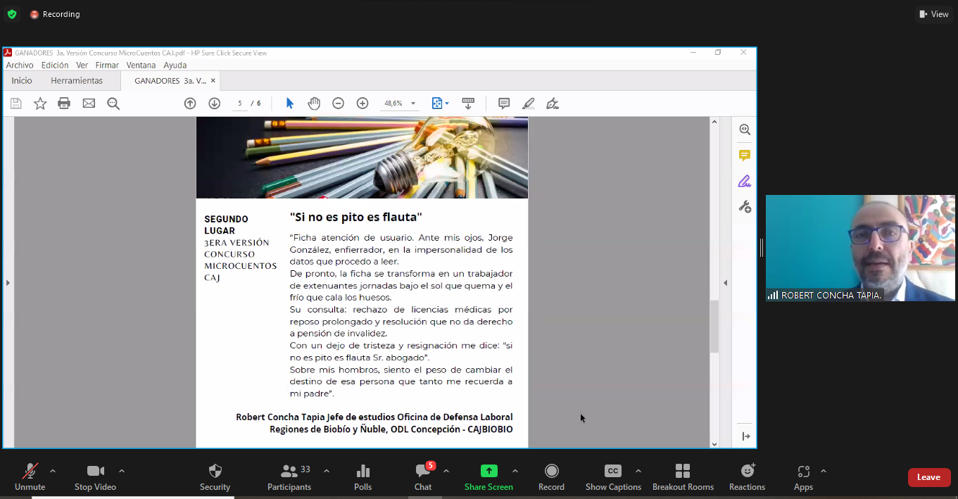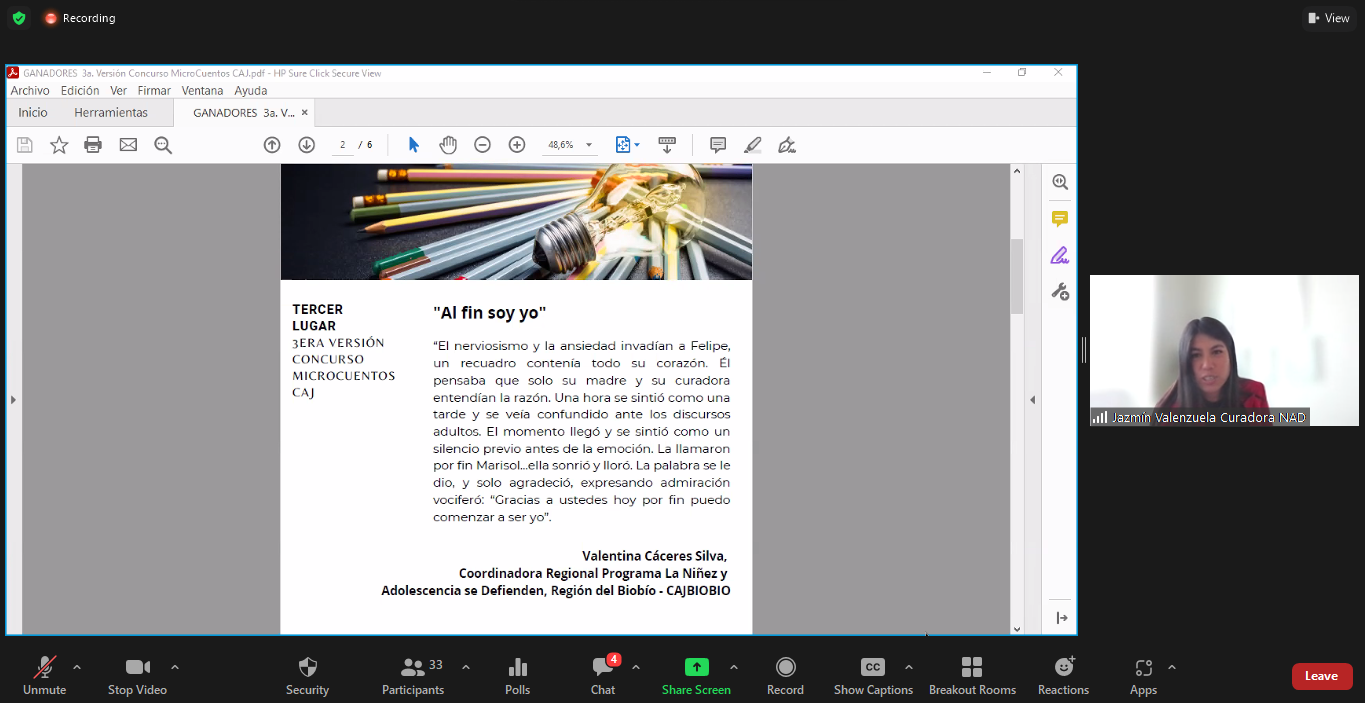 En una emotiva ceremonia virtual, funcionarias y funcionarios de las Corporaciones de Asistencia Judicial (CAJ) fueron reconocidos por su destacada participación en la 3ra versión del Concurso de Microcuentos, organizada en el marco del Plan Nacional de Visibilización del servicio.