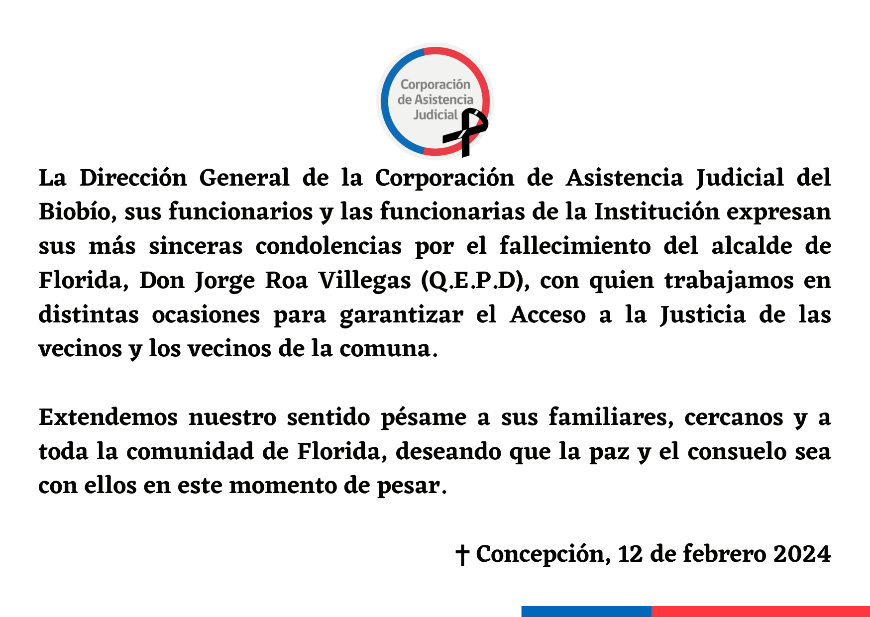 La Dirección General de la Corporación de Asistencia Judicial del Biobío, sus funcionarios y las funcionarias de la Institución expresan sus más sinceras condolencias por el fallecimiento del alcalde de Florida, Don Jorge Roa Villegas (Q.E.P.D), con quien trabajamos en distintas ocasiones para garantizar el Acceso a la Justicia de las vecinos y los vecinos de la comuna. Extendemos nuestro sentido pésame a sus familiares, cercanos y a toda la comunidad de Florida, deseando que la paz y el consuelo sea con ellos en este momento de pesar.