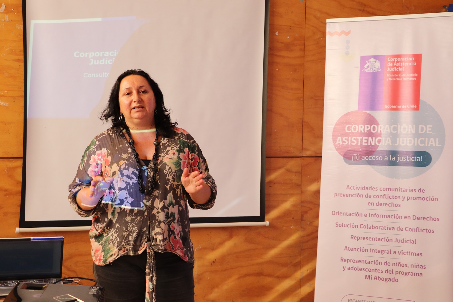 Yasna Contreras Palma, abogada jefa del Consultorio Jurídico de la CAJ en San Pedro de la Paz, fue acompañada por la Asistente Social, Claudia Tobar Beluzán, quien expuso sobre el trabajo que realiza la Corporación de Asistencia Judicial en toda su jurisdicción desde Ñuble hasta Aysén.