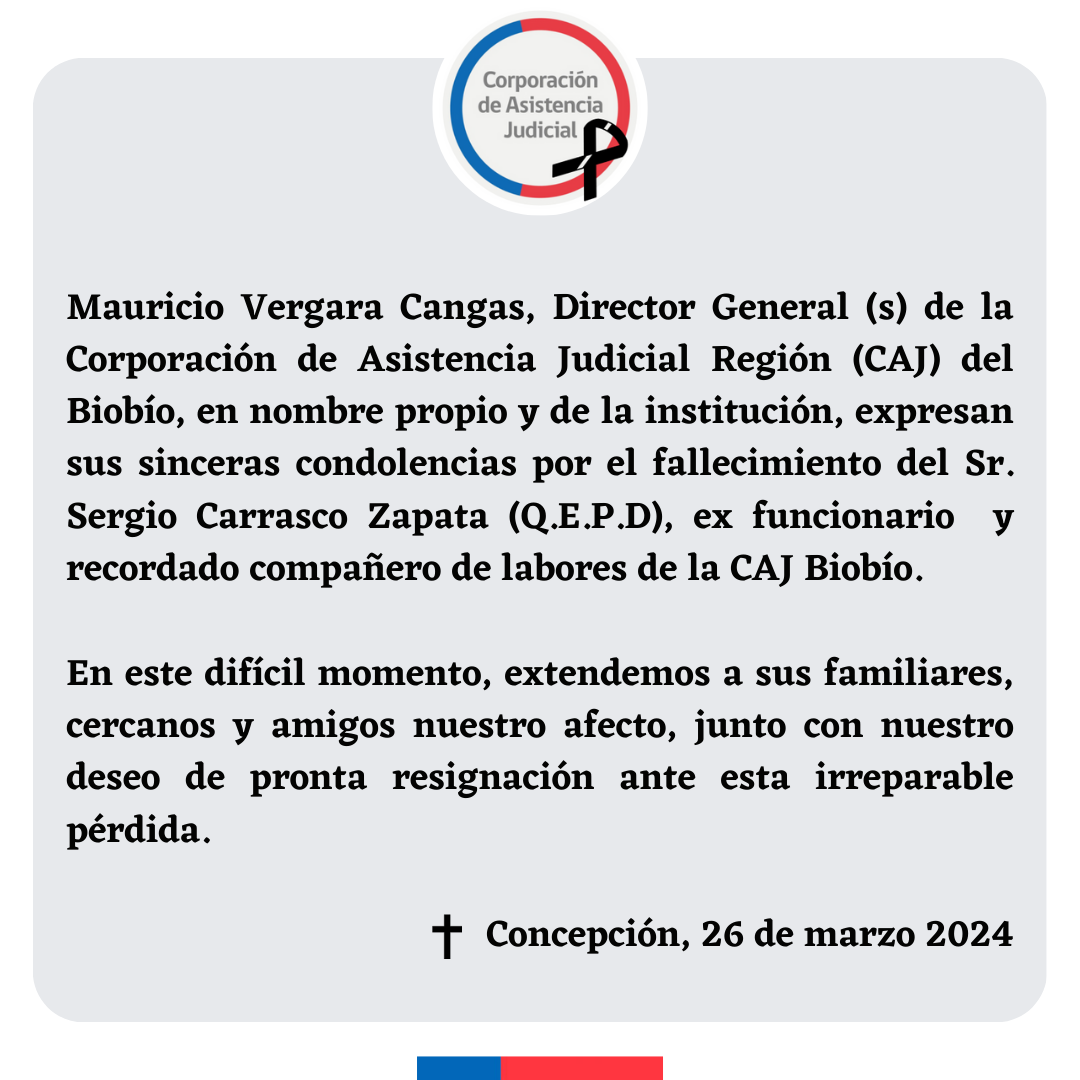 La Corporación de Asistencia Judicial (CAJ) del Biobío extiende sus condolencias por el sensible fallecimiento del Sr. Sergio Carrasco Zapata, ex funcionario de la Dirección General de la CAJ Biobío y recordado compañero de labores.