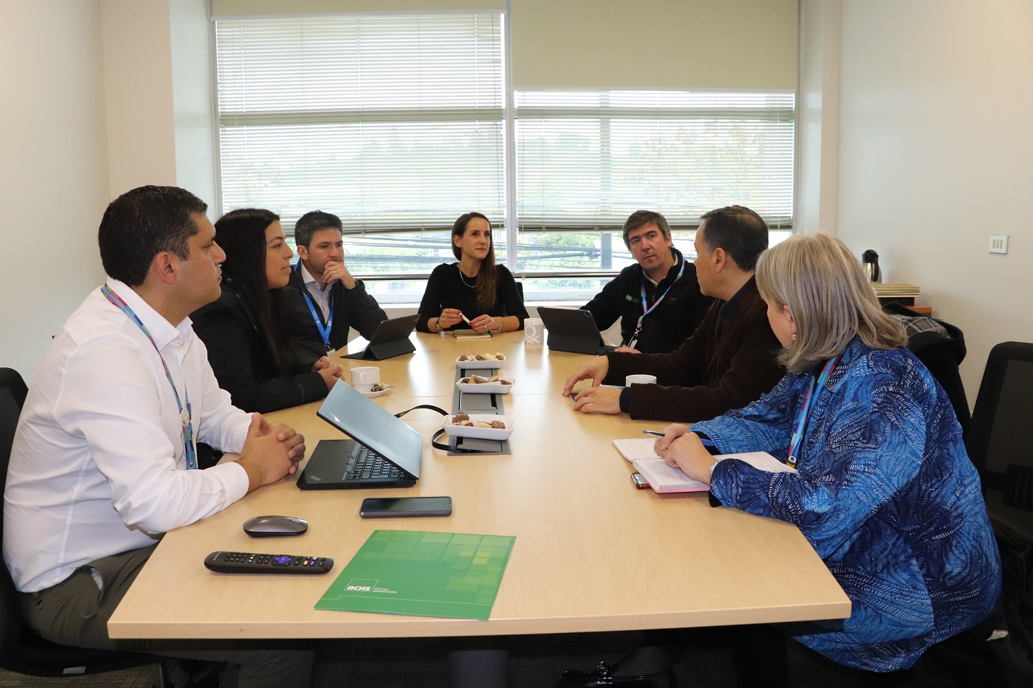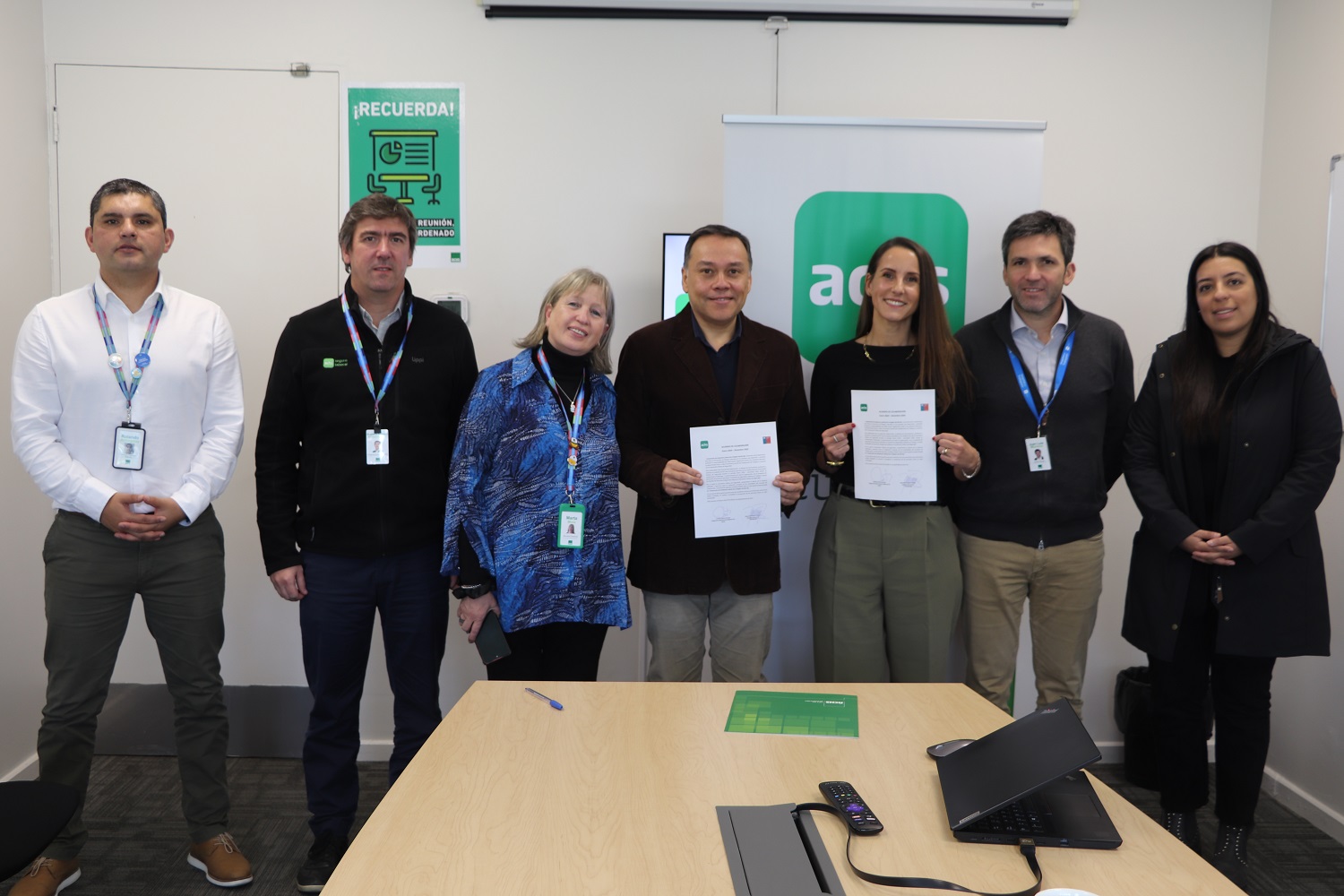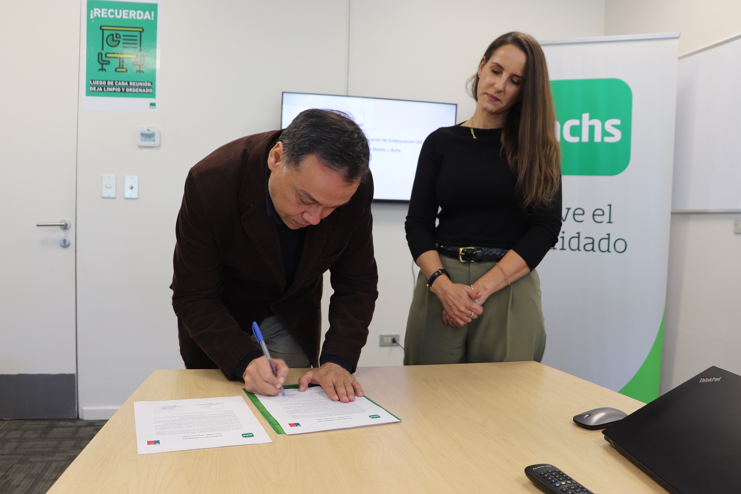 El Director General (S) de la CAJ Biobío, Mauricio Vergara Cangas, en compañía de la prevencionista de riesgo del servicio, Paula Concha Betancourt; junto a los directivos de la mutualidad, compuestos por el Gerente General Achs, Juan Luis Moreno Zuloaga, el Gerente División Comercial Y Servicios Preventivos, Gustavo Antonio Etchegaray Díaz, la Subgerente Operaciones Regional, Cynthia Paola García Astorga y el Experto en Grandes Cuentas Achs, Rolando Arriagada Arévalo participaron de la firma del convenio en dependencias de dicha organización.