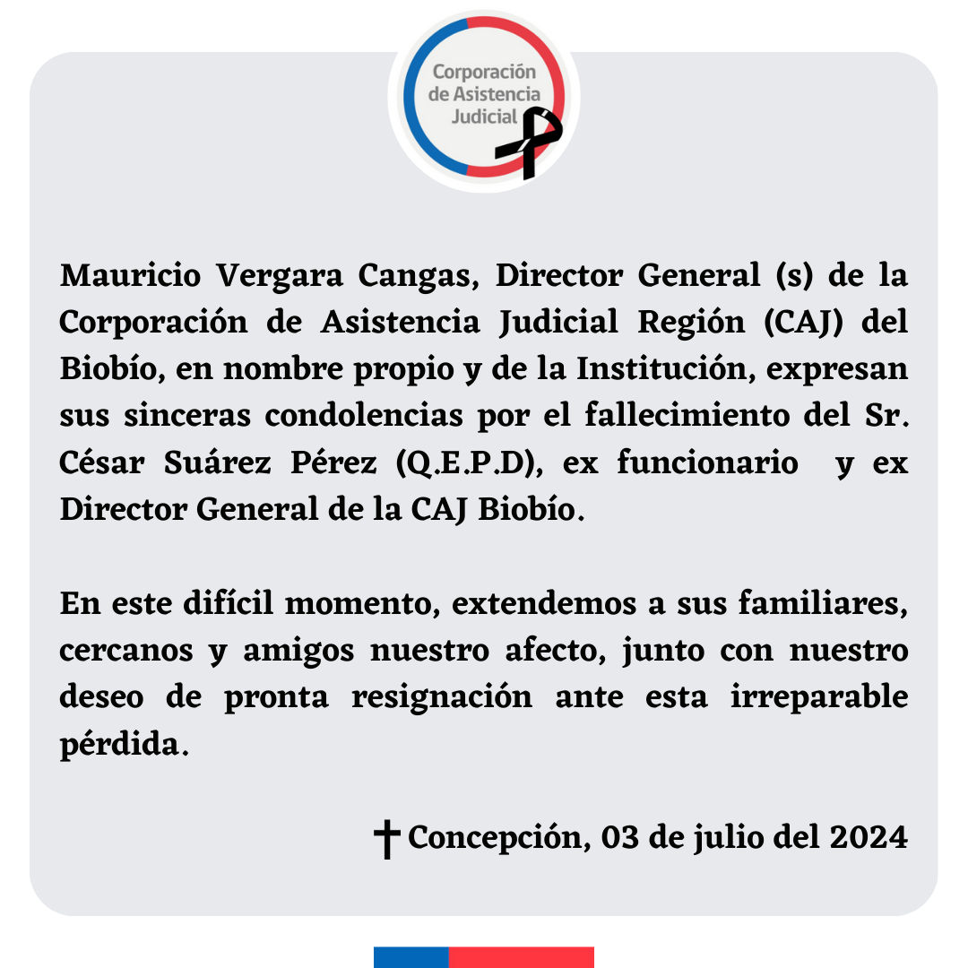 Mauricio Vergara Cangas, Director General (s) de la Corporación de Asistencia Judicial Región (CAJ) del Biobío, en nombre propio y de la Institución, expresan sus sinceras condolencias por el fallecimiento del Sr. César Suárez Pérez (Q.E.P.D), ex funcionario y ex Director General de la CAJ Biobío.