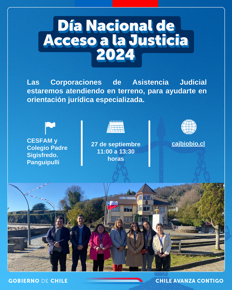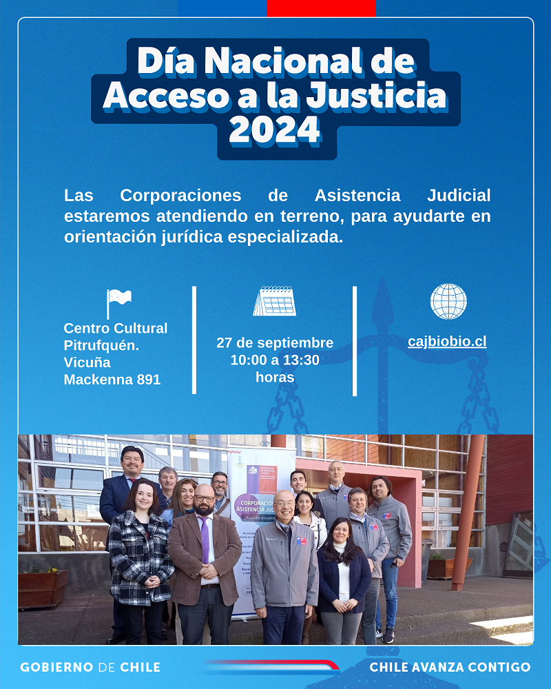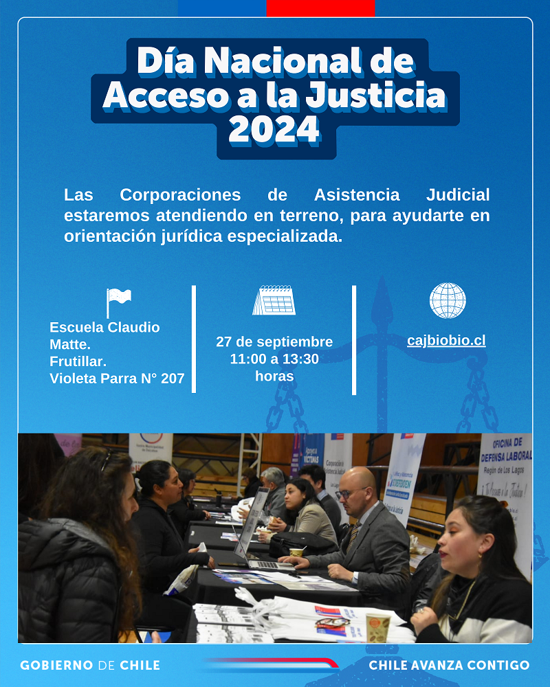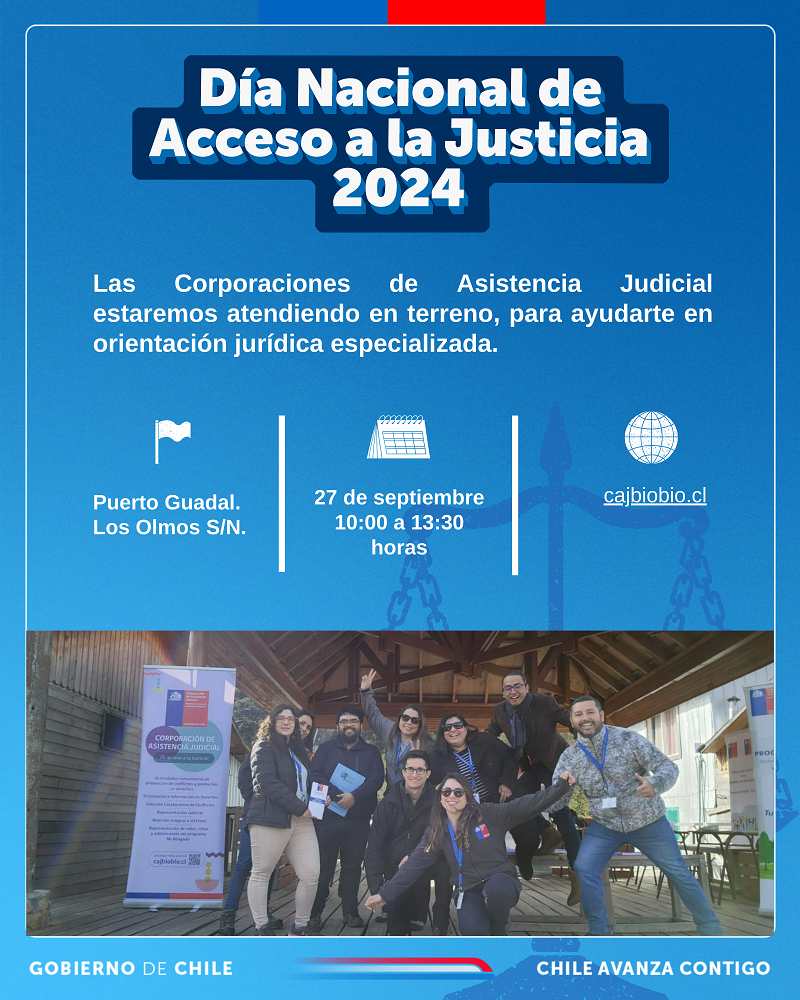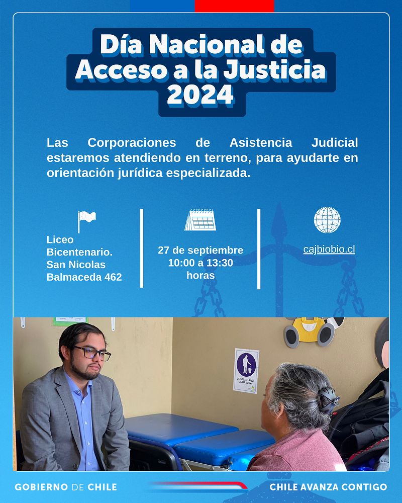 El acceso a la justicia es clave para garantizar la igualdad y la protección de los derechos de todas las personas. En ese sentido y con el fin de acercar la justicia a la ciudadanía y brindar orientación y asistencia jurídica, el 27 de septiembre las Corporaciones de Asistencia Judicial conmemorarán, en todas las regiones del país, el "Día Nacional de Acceso a la Justicia".