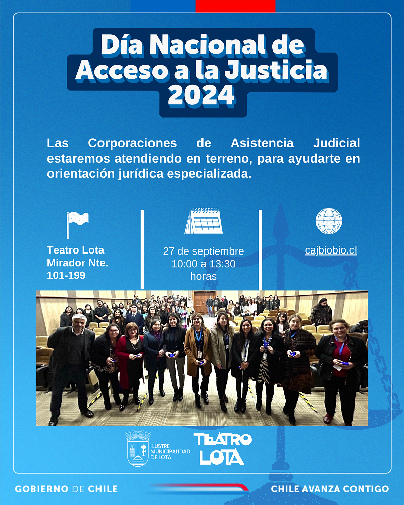 | Biobío | Dirección: Mirador Nte. 101-199, Lota, Bío Bío. Teatro Lota Horario: 10:00 a 14:00 horas Características de la actividad: Plaza de acceso a la Justicia. Se realizará charla abierta de responsabilidad penal. |