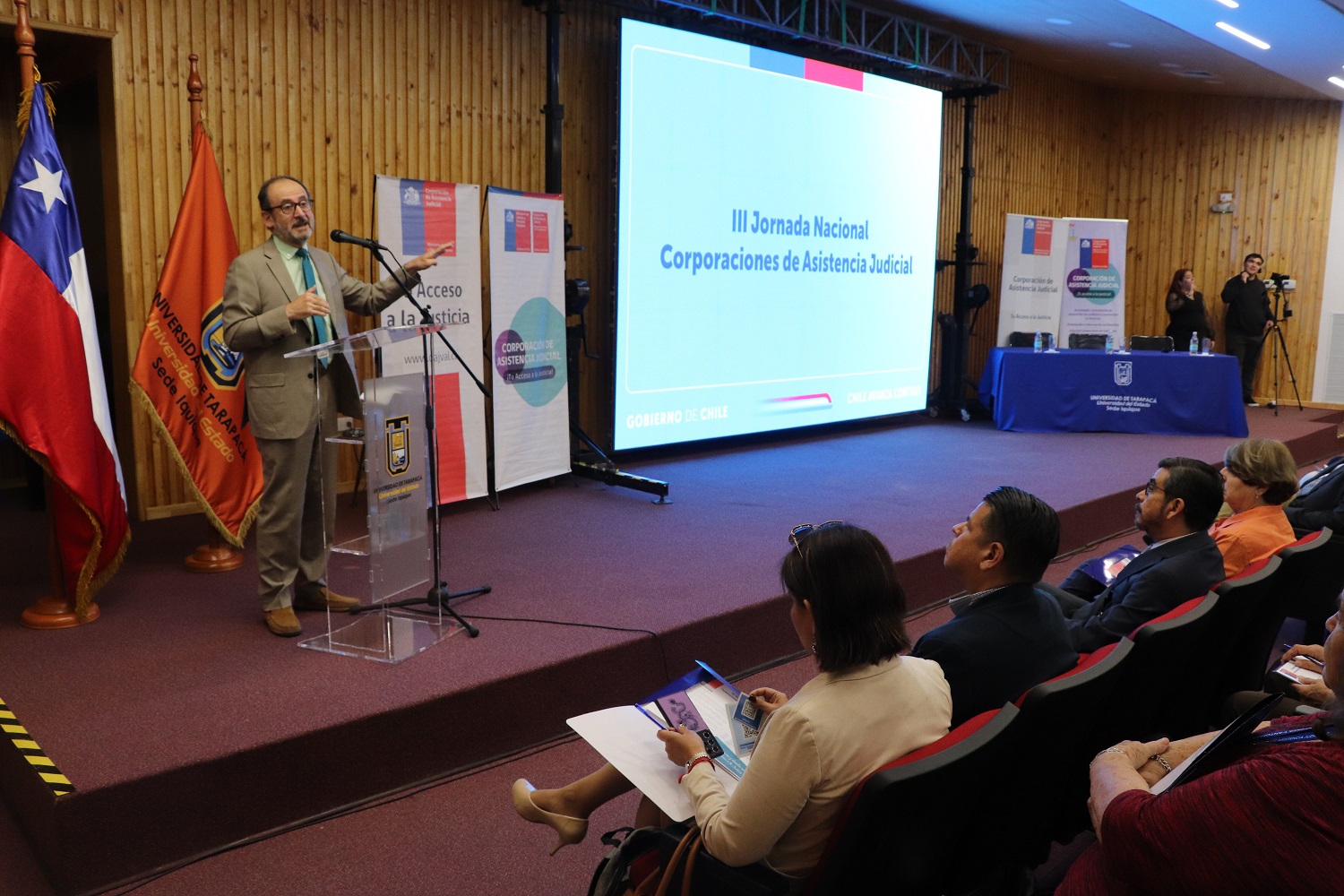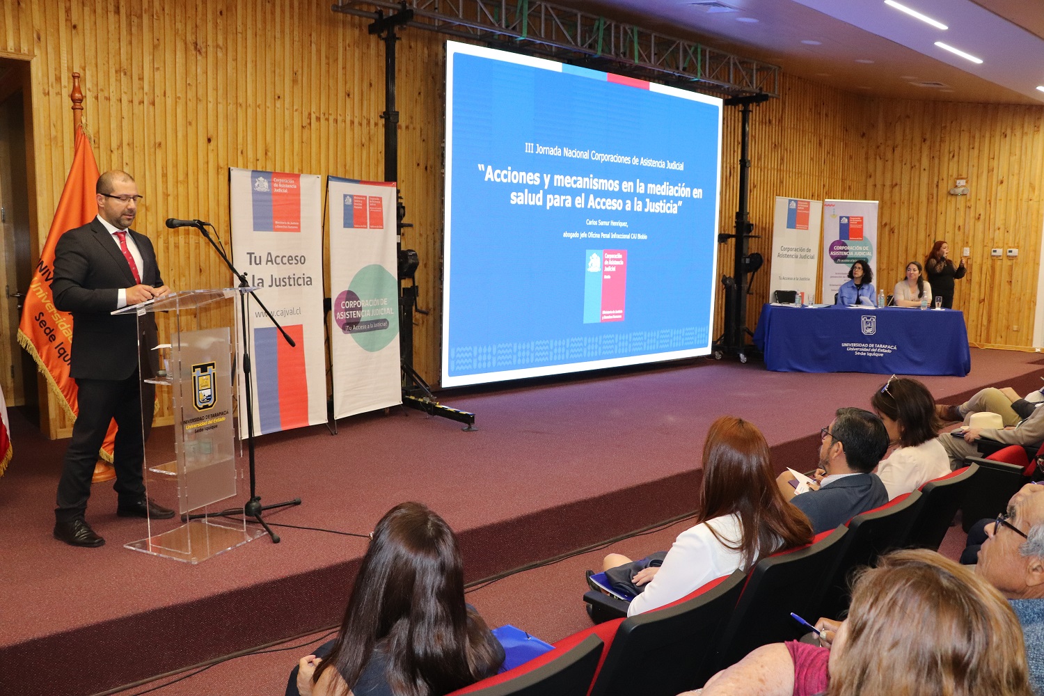 • El encuentro, organizado por las cuatro CAJ del país, reunió tres exposiciones sobre la labor desarrollada por el servicio para garantizar la misión de hacer posible el acceso a la justicia de las personas. • El hito contó con la participación de representantes del Ministerio de Justicia y Derechos Humanos, autoridades locales e invitados especiales, quienes acompañaron a la y los directora y directores generales de las CAJ de Tarapacá, Metropolitana y del Biobío.