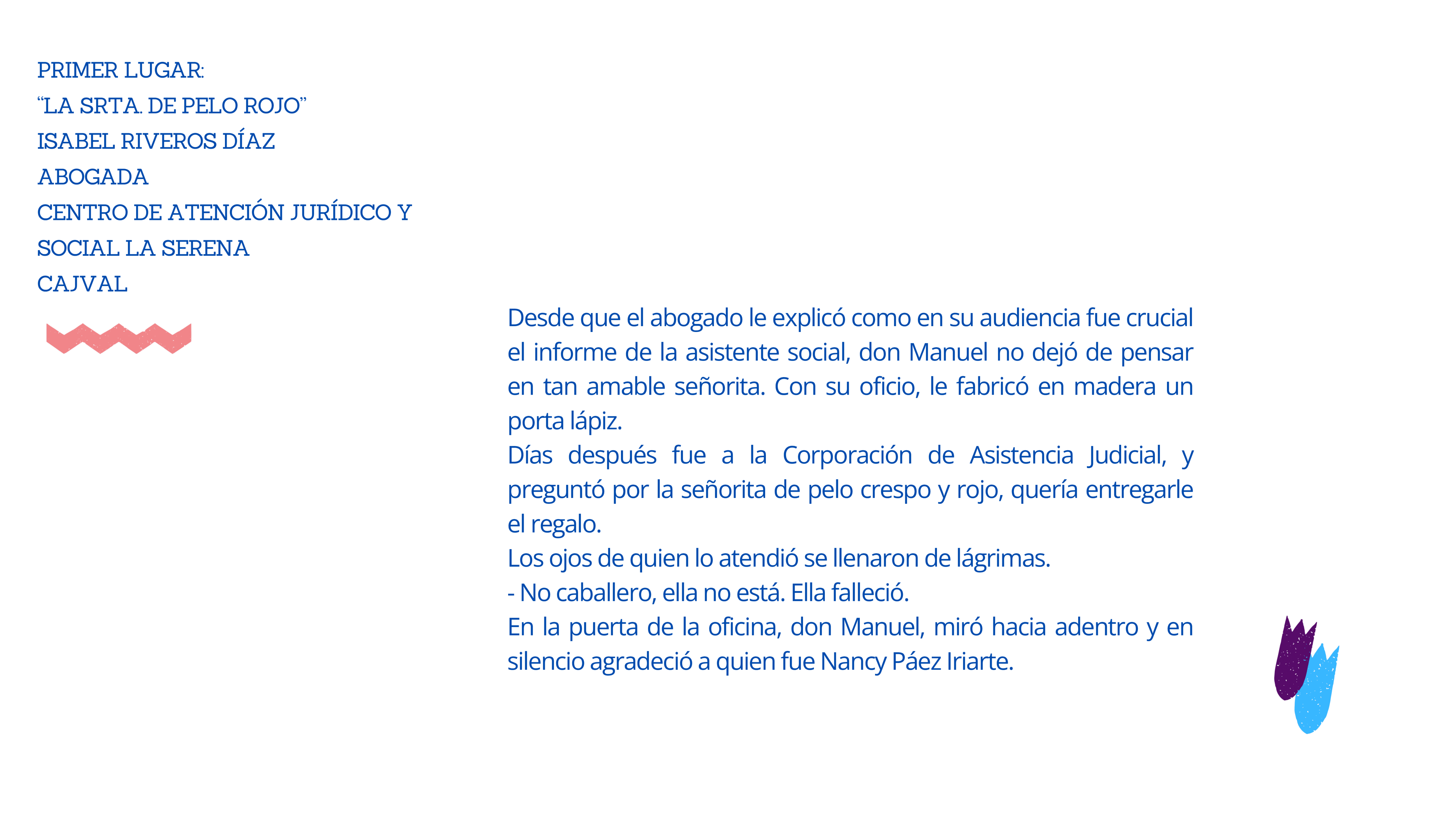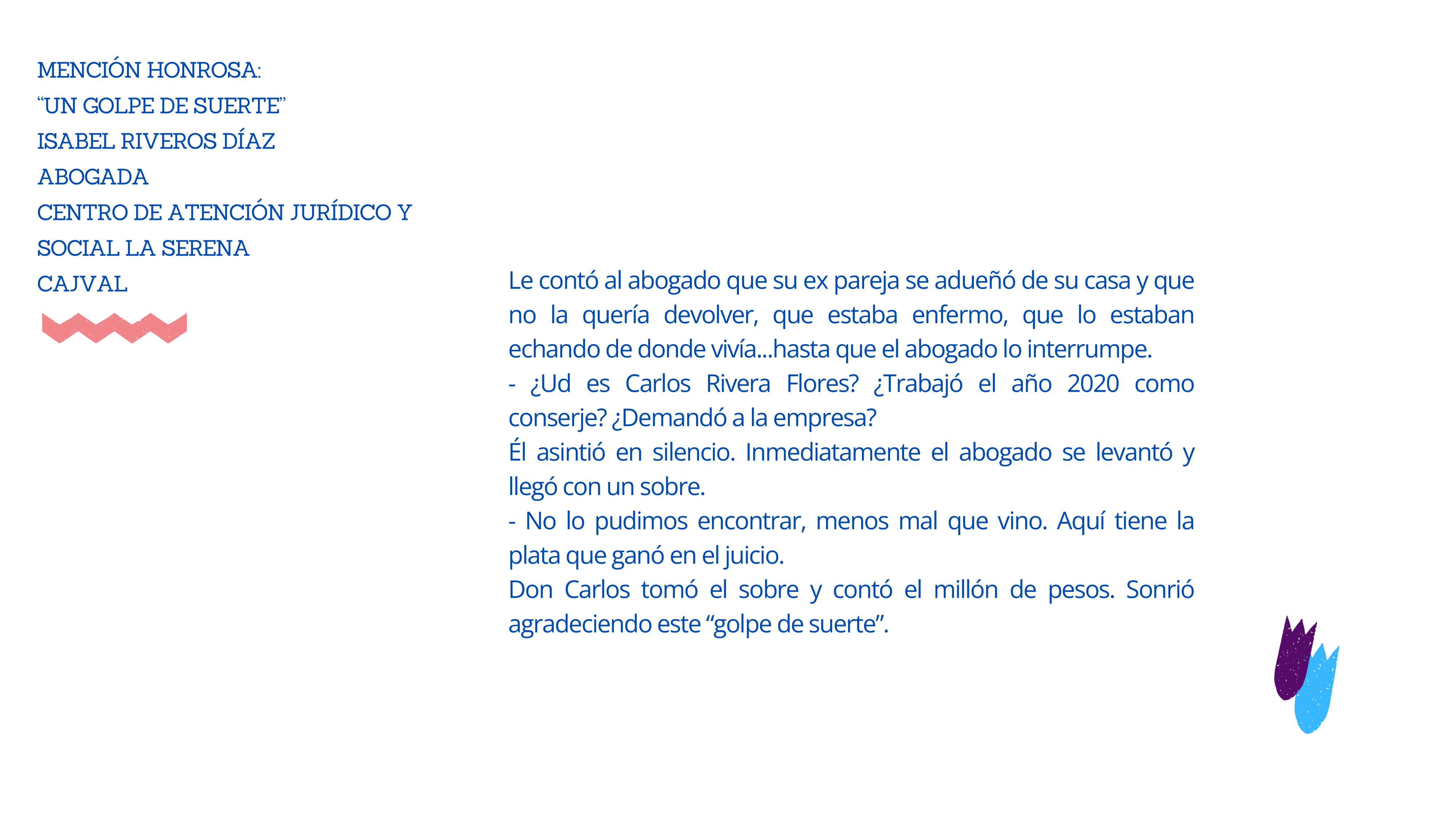 - Mención honrosa Un golpe de suerte Isabel Riveros Díaz Abogada, Centro de Atención Jurídico y Social La Serena CAJVAL.