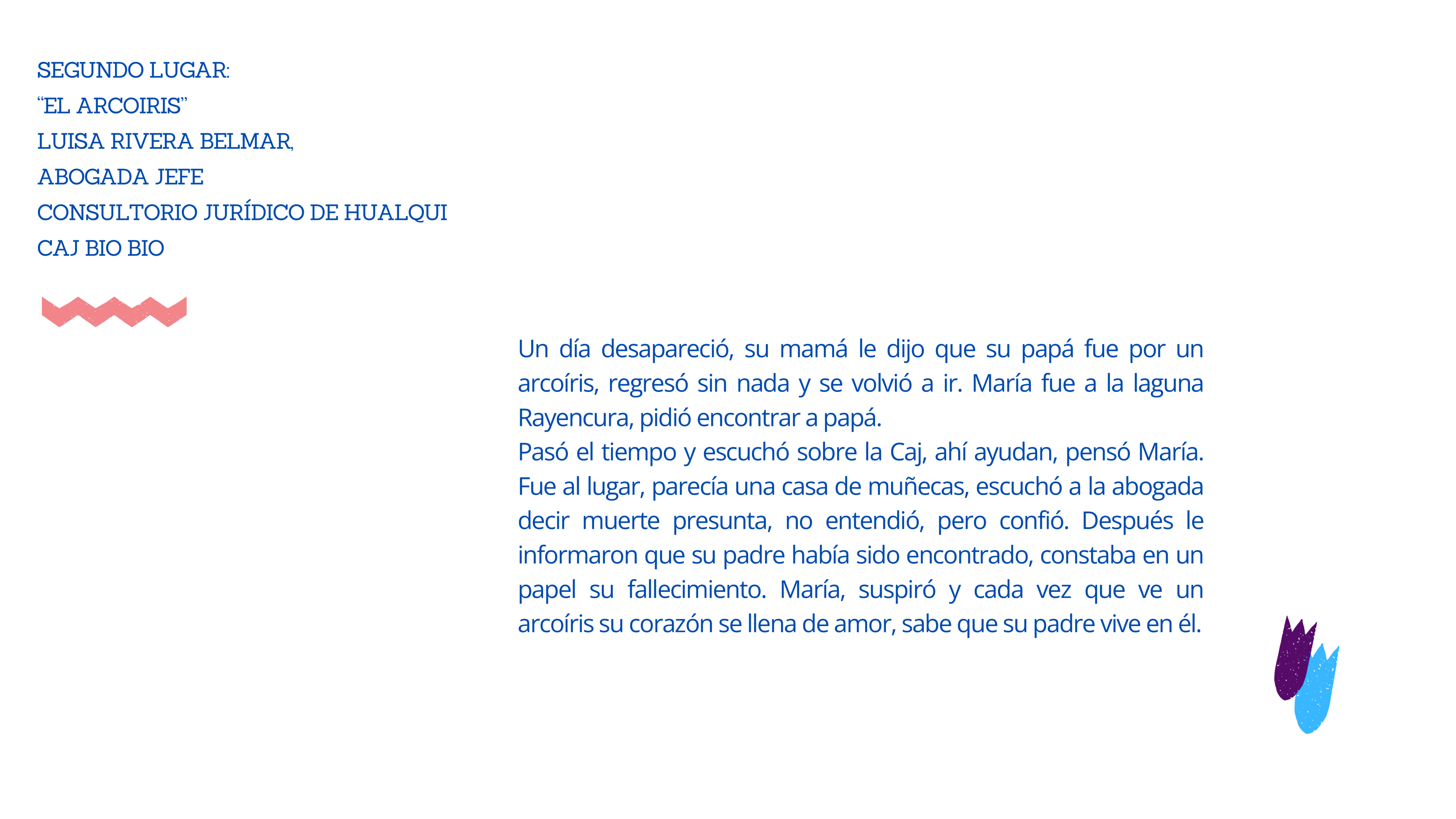 - 2° lugar El Arcoiris Luisa del Pilar Rivera Belmar Abogada Jefe, Consultorio Jurídico de Hualqui, CAJBIOBIO.