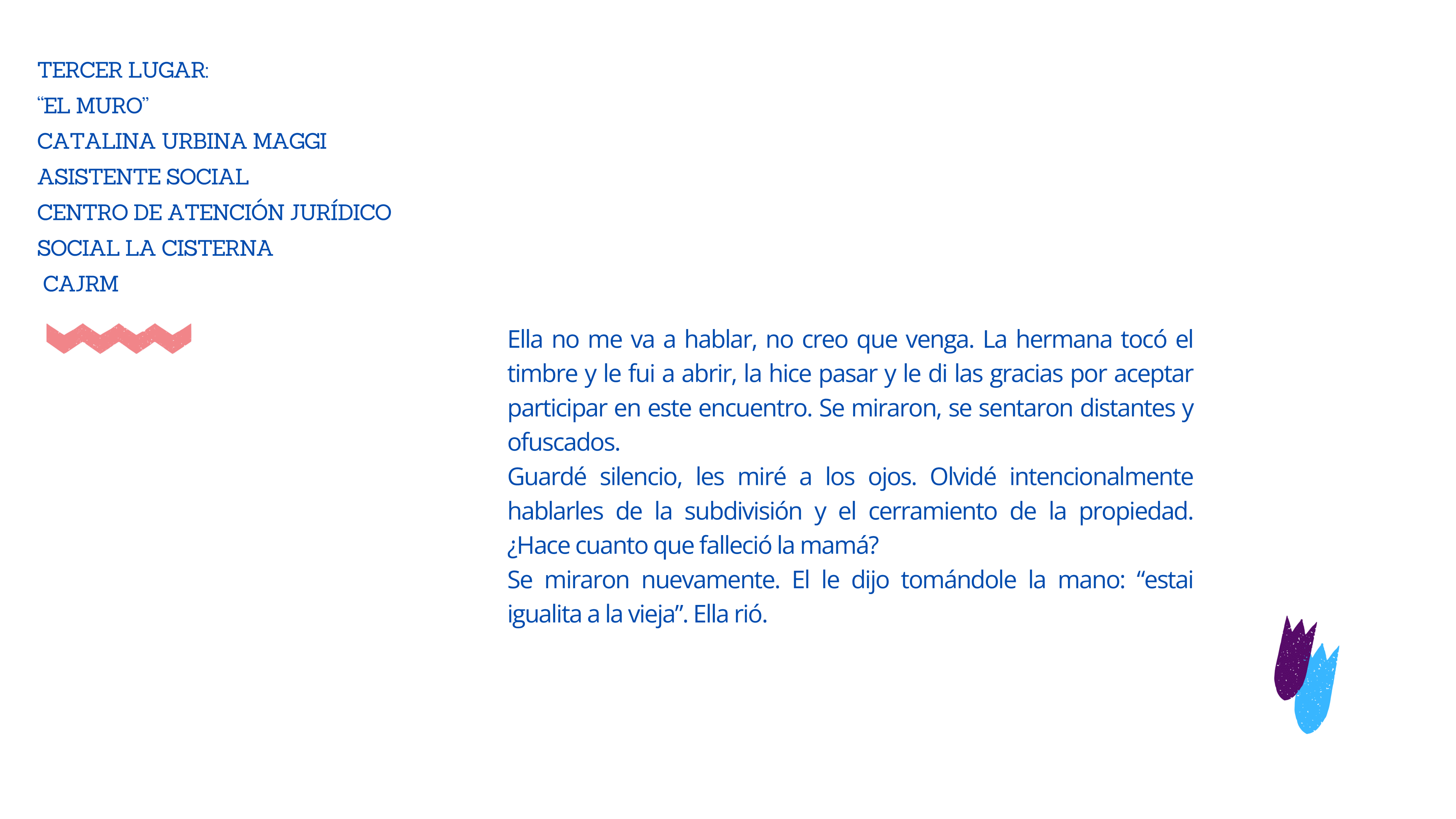 - 3er lugar El muro Catalina Urbina Maggi Asistente social, Centro de Atención Jurídico Social La Cisterna, CAJRM.
