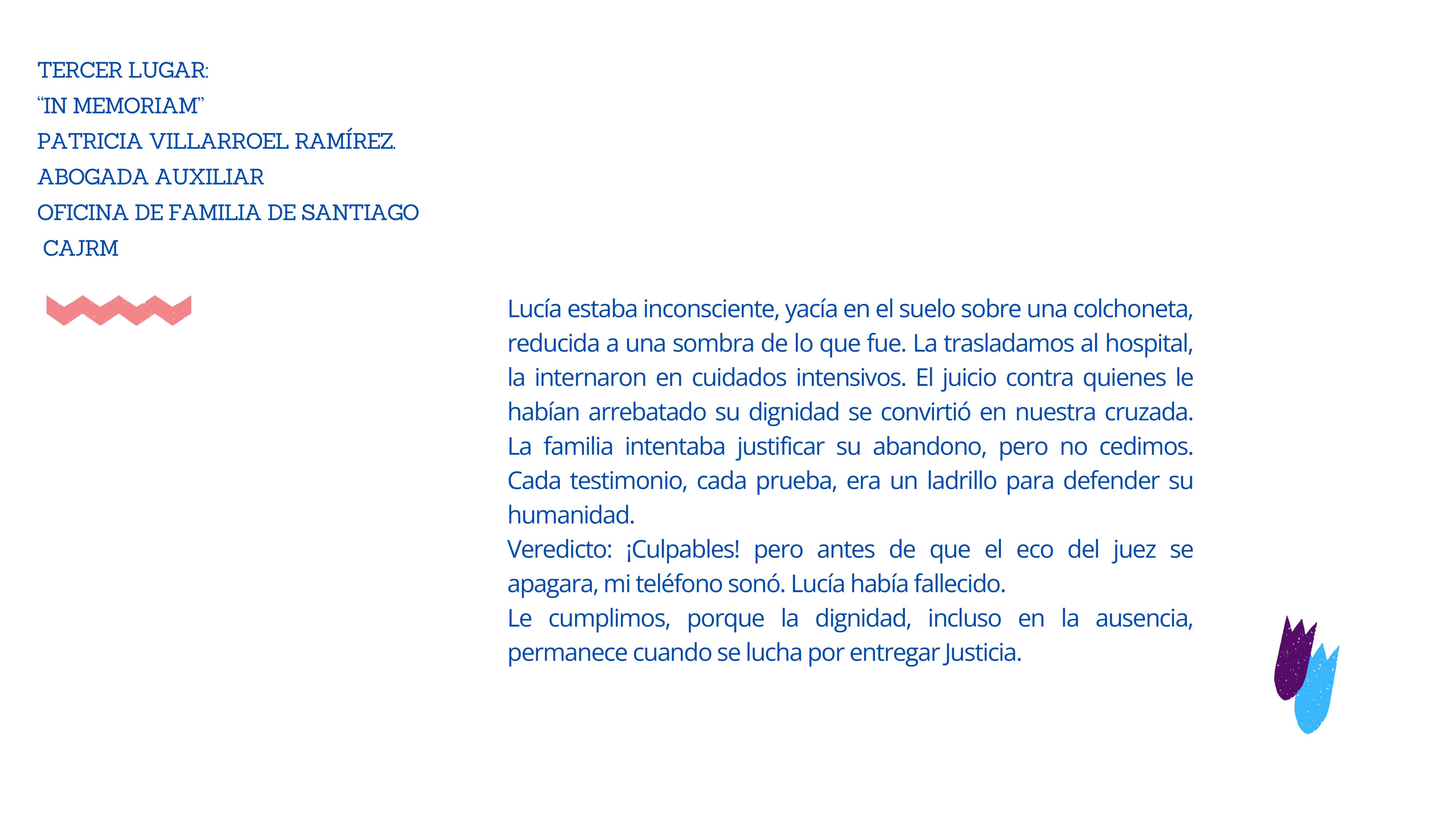 - 3er lugar In Memoriam Patricia Verónica Villarroel Ramírez Abogada auxiliar, Oficina de Familia de Santiago, CAJRM.