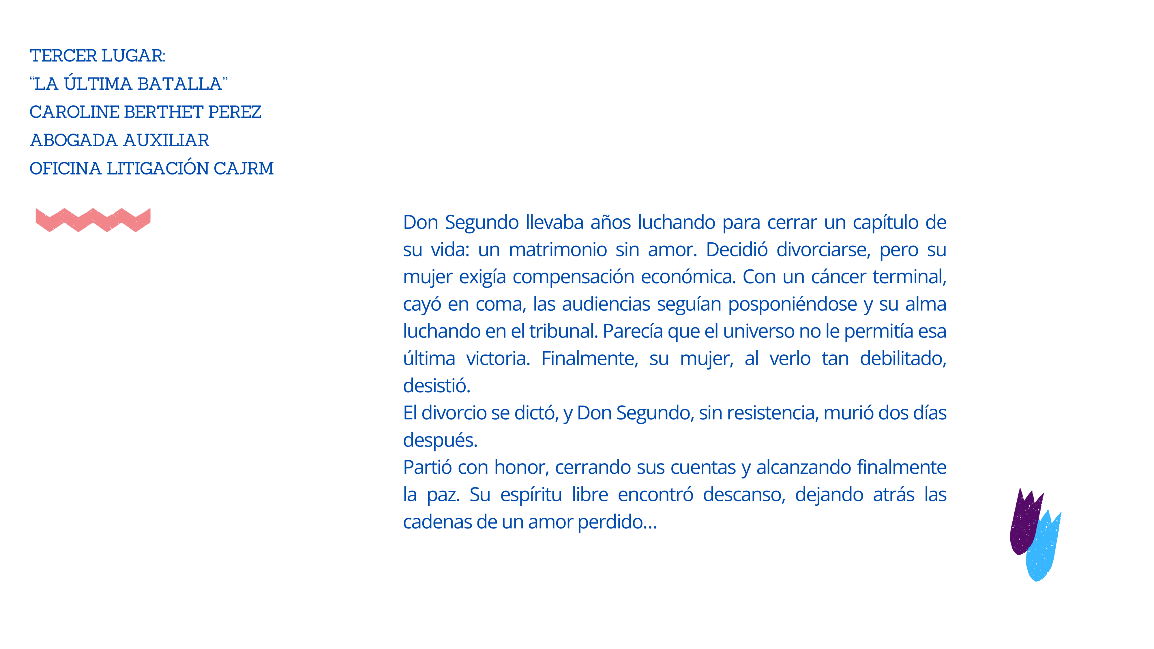 - 3er lugar La última batalla Caroline Denisse Berthet Pérez Abogada auxiliar, Oficina litigación, CAJRM.