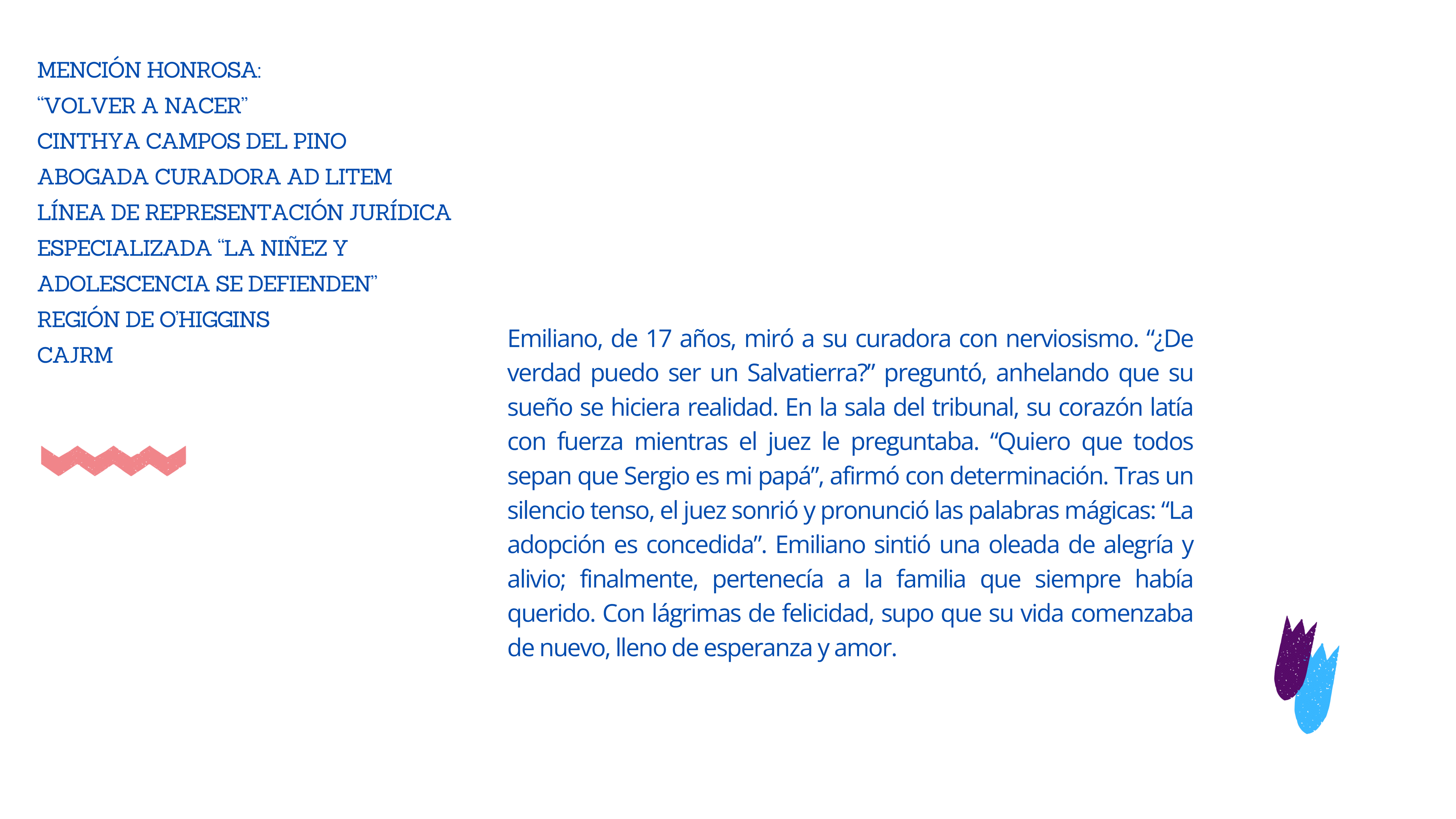 - Mención honrosa Volver a nacer Cinthya Nicole Campos Del Pino Abogada Curadora Ad Litem, Línea de Representación Jurídica Especializada “La Niñez y Adolescencia se Defienden” Región del Libertador General Bernardo O’Higgins, CAJRM .
