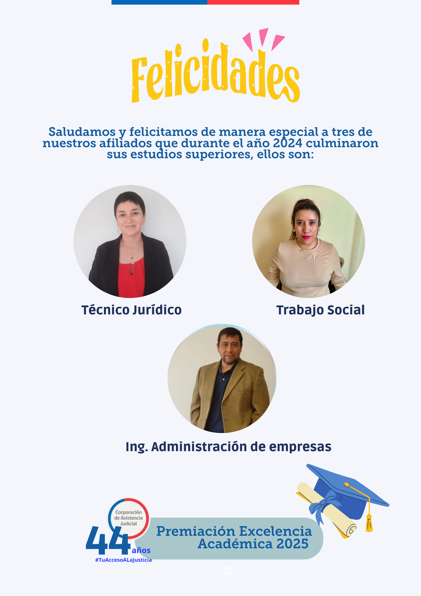Entre los destacados, además, se reconoció el esfuerzo de dos funcionarias y un funcionario, quienes culminaron sus estudios superiores el año recién pasado. Ellos son Paola Iraira (Técnico Jurídico), Abraham González (Ingeniería en Administración de Empresas) y Rosalía Hernández (Trabajo Social).