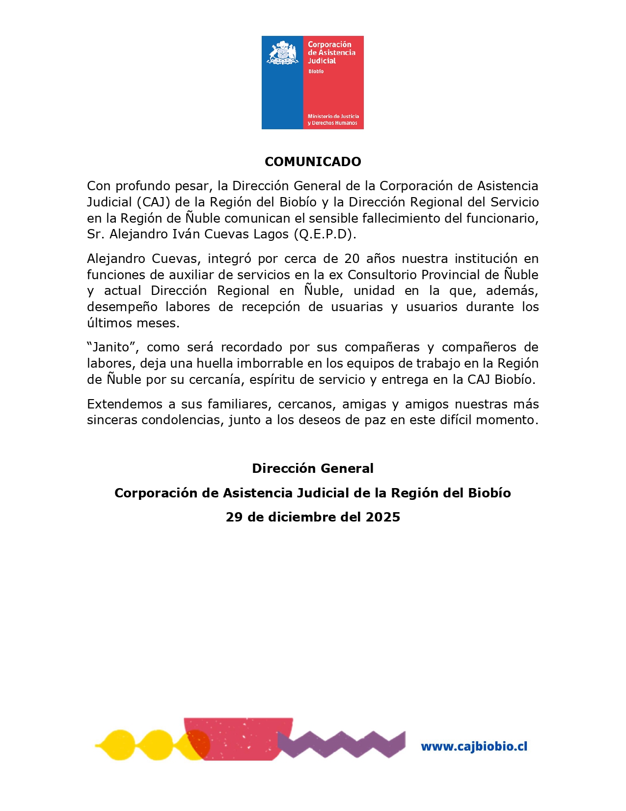 Alejandro Cuevas, integró por cerca de 20 años nuestra institución en funciones de auxiliar de servicios en la ex Consultorio Provincial de Ñuble y actual Dirección Regional en Ñuble, unidad en la que, además, desempeño labores de recepción de usuarias y usuarios durante los últimos meses.