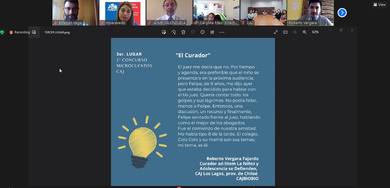 Tercer lugar: “El Curador” de Roberto Vergara Fajardo, Curador Ad Litem de la línea de representación especializada “La Niñez y Adolescencia se Defienden”, CAJ de Los Lagos, provincia de Chiloé, CAJBIOBIO.