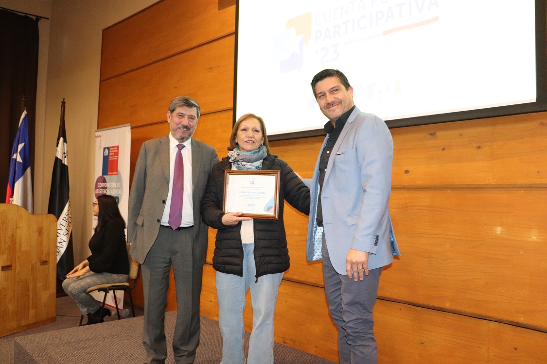 El evento permitió realizar un reconocimiento a la presidenta del Consejo de la Sociedad Civil (Cosoc), Luisa Catalán, que este 2023 dejará el cargo. “Ha sido un honor trabajar con la Corporación de Asistencia Judicial, pero llegó el momento de dar espacio a nuevos dirigentes que puedan ser un aporte a esta institución”, destacó la dirigente vecinal durante la ceremonia.
